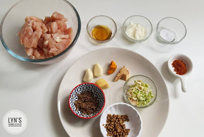 Mix together chicken chunks/strips with the spices in a bowl. Then add in plain yogurt, honey, chili powder and salt to taste. Mix well, cover the bowl with cling wrap and marinate for at least 30 minutes. You can left your chicken marinated at room temperature (if you opt to marinade only for 30 minutes) or refrigerate until you're ready to cook the chicken.